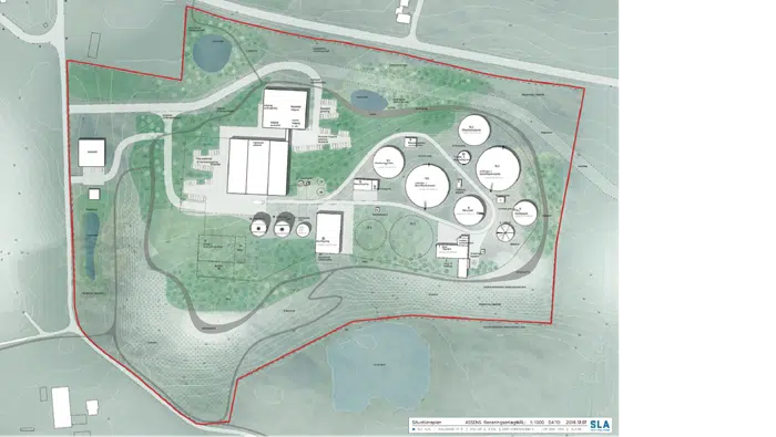 Illustrationsplan, der viser hvordan det nye Assens Renseanlæg kan komme til at tage sig ud.