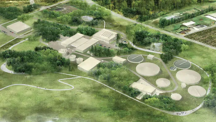 Illustration af, hvordan det nye renseanlæg kan komme til at se ud - set fra luften.